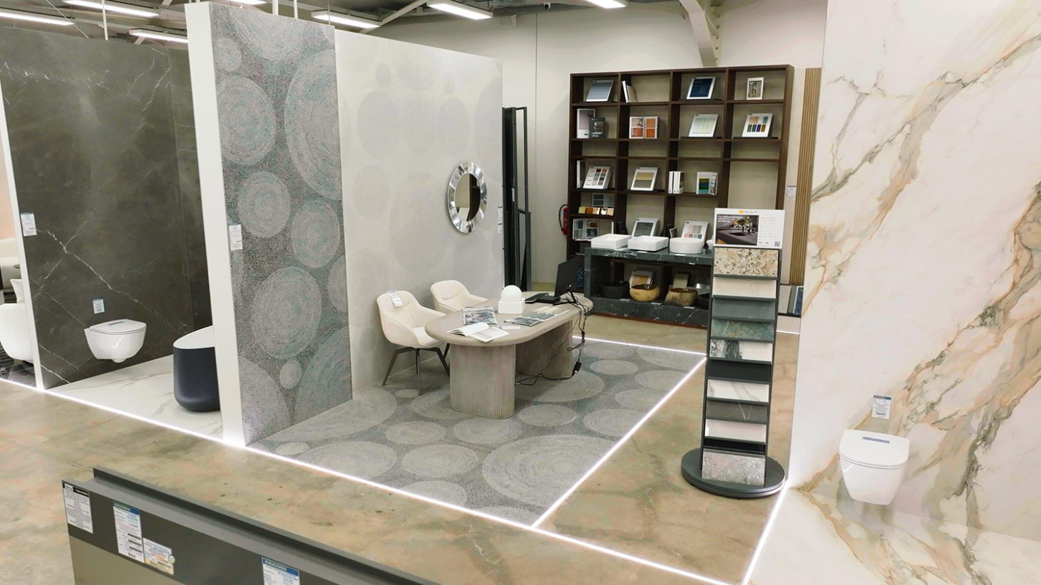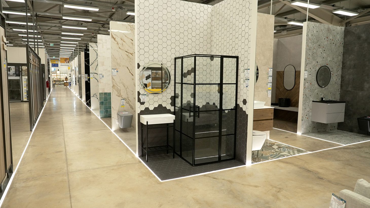 Συνεχίζοντας θα ανακαλύψεις την περίφημη, πλήρη συλλογή σε πλακάκια παντός σχεδίου και διαφόρων υφών, όλες τις σύγχρονες τάσεις σε είδη υγιεινής, πολλές προτάσεις για πατώματα laminate, και φυσικά την premium συλλογή Privé, με επώνυμα προϊόντα υψηλής αισθητικής, η οποία προσφέρει αρχιτεκτονικές λύσεις κορυφαίου επιπέδου, όπως τα πλακάκια slabs 160×320 cm, ιδανικά για εντυπωσιακές επιφάνειες σε μπάνια, πάγκους κουζίνας και τραπεζαρίες, χώρους εστίασης και ξενοδοχεία.