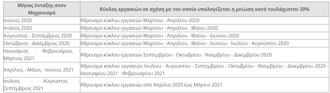 α. Επιχειρήσεις-εργοδότες που υποχρεούνται σε υποβολή περιοδικής δήλωσης ΦΠΑ πρέπει να παρουσιάζουν μείωση κατά 20% τουλάχιστον του κύκλου εργασιών ΦΠΑ (κωδικός 312 περιοδικής δήλωσης ΦΠΑ), σε σχέση με τον κύκλο εργασιών αναφοράς, ανάλογα με τον μήνα ένταξής τους στον Μηχανισμό «ΣΥΝ-ΕΡΓΑΣΙΑ» και το είδος των φορολογικών βιβλίων, ως εξής:
