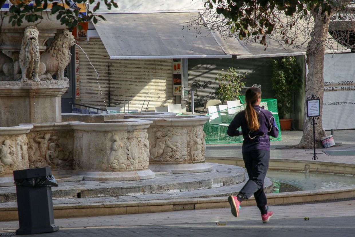 Με εξαίρεση απειροελάχιστους πολίτες που έχουν βγει για τζόκινγκ, οι δρόμοι της πόλης του Ηρακλείου έχουν μια απόκοσμη εικόνα που δεν θυμίζει σε τίποτα το κέντρο που έσφυζε από ζωή το πρωί της Δευτέρας.