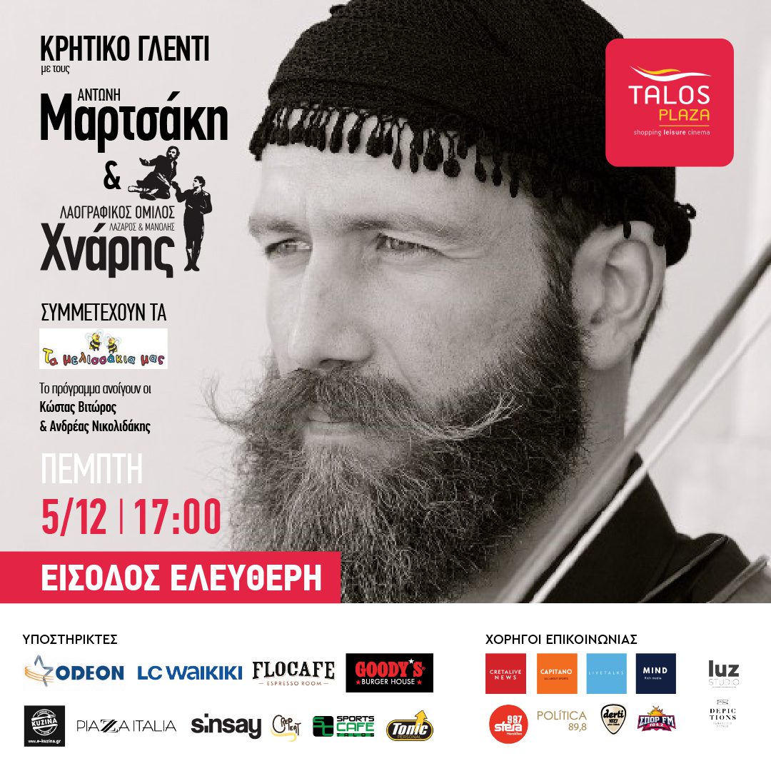 5/12 Κρητικό Γλέντι με τον Αντώνη Μαρτσάκη και το Λαογραφικό όμιλο Χνάρη _ Τη βραδιά ανοίγουν οι Κώστας Βιτώρος και Ανδρέας Νικολιδάκης. Φιλική συμμετοχή : «τα Μελισσάκια μας» από τις 17:00 / Δωρεάν συμμετοχή