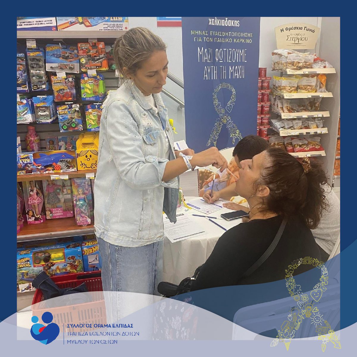Πάνω από 5.000 επισκέπτες των super markets Χαλκιαδάκης είδαν το σχετικό ενημερωτικό υλικό στα καταστήματά μας, πολλοί εκ των οποίων ενημερώθηκαν λεπτομερώς από εθελοντές του ΟΡΑΜΑΤΟΣ ΕΛΠΙΔΑΣ για τη σπουδαιότητα της δωρεάς και της υποστήριξης των παιδιών που μάχονται τον καρκίνο. Η ανταπόκριση του κόσμου ήταν συγκινητική, αποδεικνύοντας για άλλη μία φορά την αλληλεγγύη της τοπικής κοινωνίας προς τους μικρούς μαχητές.