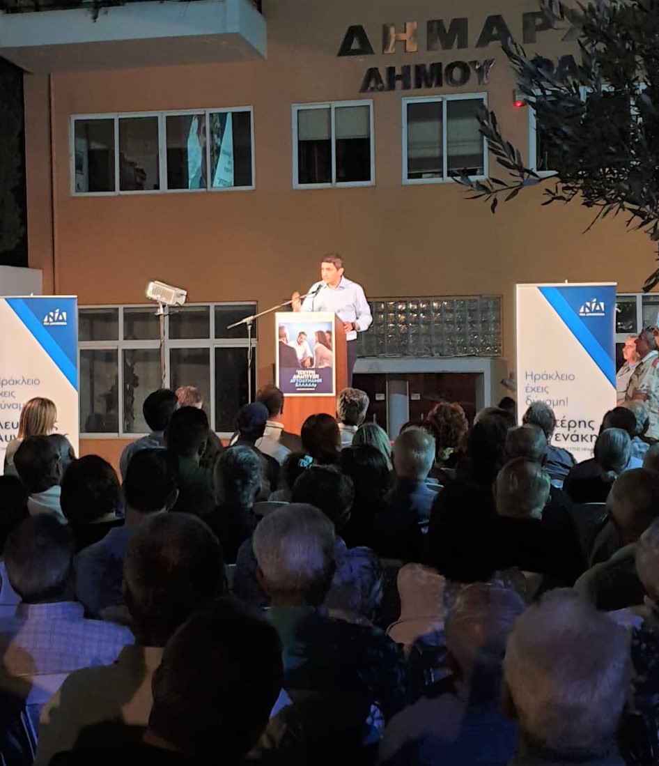 - Τώρα ακριβώς είναι η ιστορική στιγμή, να δημιουργήσουμε βγαίνοντας από την Κρίση, την Ευκαιρία για την Κρήτη και για τους Κρητικούς. Μετά από πολλά χρόνια η Ελλάδα θα έχει ξανά Κρητικό Πρωθυπουργό, τον Κυριάκο Μητσοτάκη και εμένα στο πλευρό του, στενό συνεργάτη. Σήμερα Γραμματέα στο κόμμα, και μετά τις εκλογές από άλλη θέση ευθύνης που ο επόμενος πρωθυπουργός θα αποφασίσει.