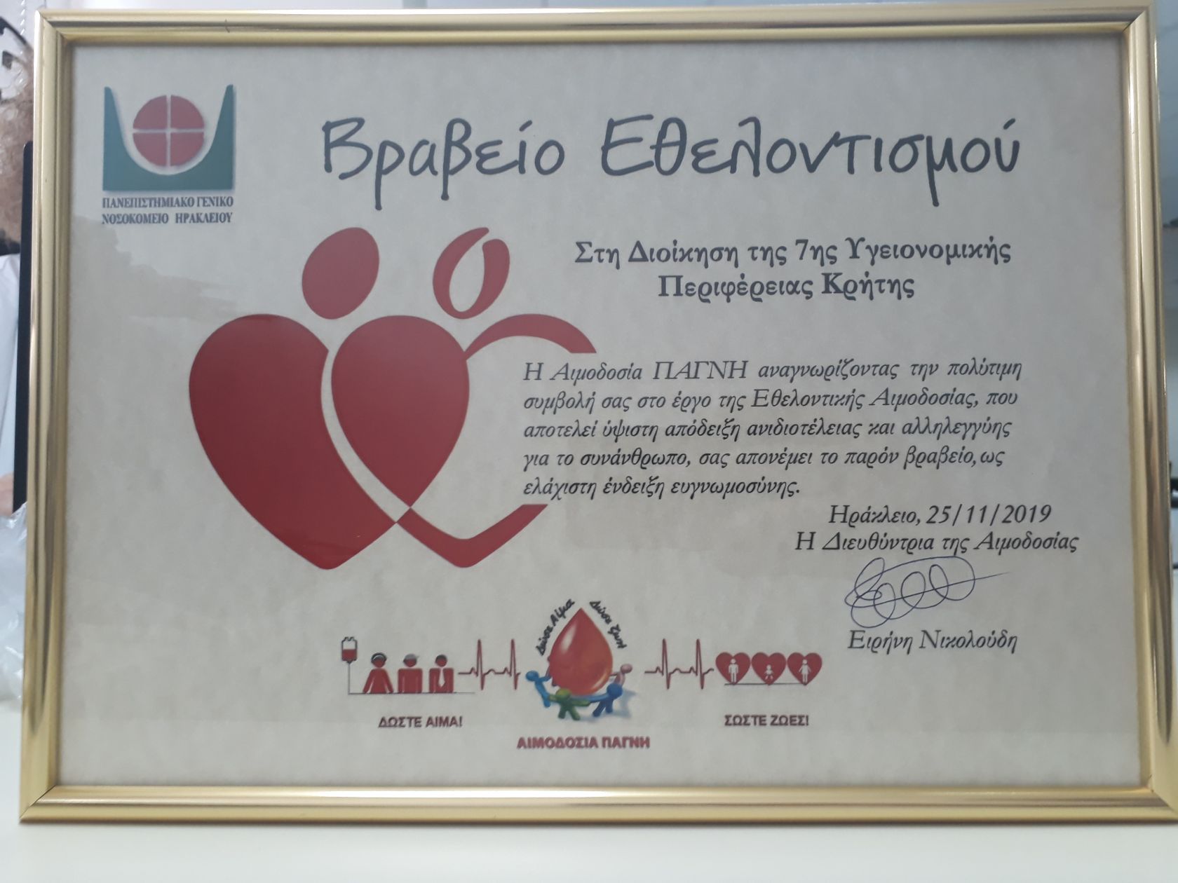 Η Αιμοδοσία ΠΑΓΝΗ θα ήθελε να ευχαριστήσει από καρδιάς τη Διοίκηση της 7ης ΥΠΕ και ιδιαιτέρως τη Διοικήτρια κ. Μπορμπουδάκη και τους υποδιοικητές κ. Λυδάκη και κ. Αγαπίου, οι οποίοι στέκονται αρωγοί σε όλες τις εκδηλώσεις της και επικροτούν κάθε Εθελοντική Δραστηριότητα που έχει ως στόχο την υποστήριξη των ασθενών της Κρήτης.