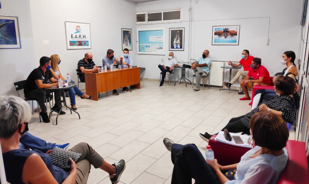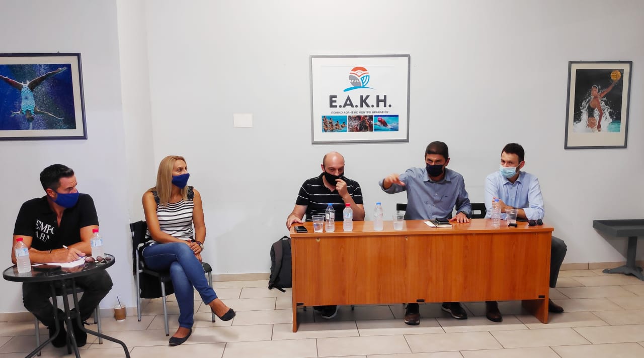 Με πρωτοβουλία της Διοικούσας Επιτροπής του ΕΑΚ Ηρακλείου, παρουσία του Υφυπουργού Αθλητισμού, Λευτέρη Αυγενάκη, του Αντιδημάρχου Ηρακλείου, αρμοδίου για θέματα αθλητισμού, Κώστα Βαρδαβά και μελών της Περιφερειακής Επιτροπής Κολύμβησης Υδατοσφαίρισης Κρήτης και Ρόδου, πραγματοποιήθηκε συνάντηση το απόγευμα της Παρασκευής 25 Σεπτεμβρίου, στο Κολυμβητήριο Λίντο.