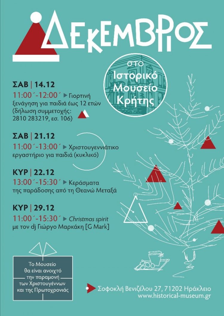 Εορταστικές εκδηλώσεις θα λάβουν χώρα στο Ιστορικό Μουσείο Κρήτης, που απευθύνονται σε παιδιά όλων των ηλικιών.