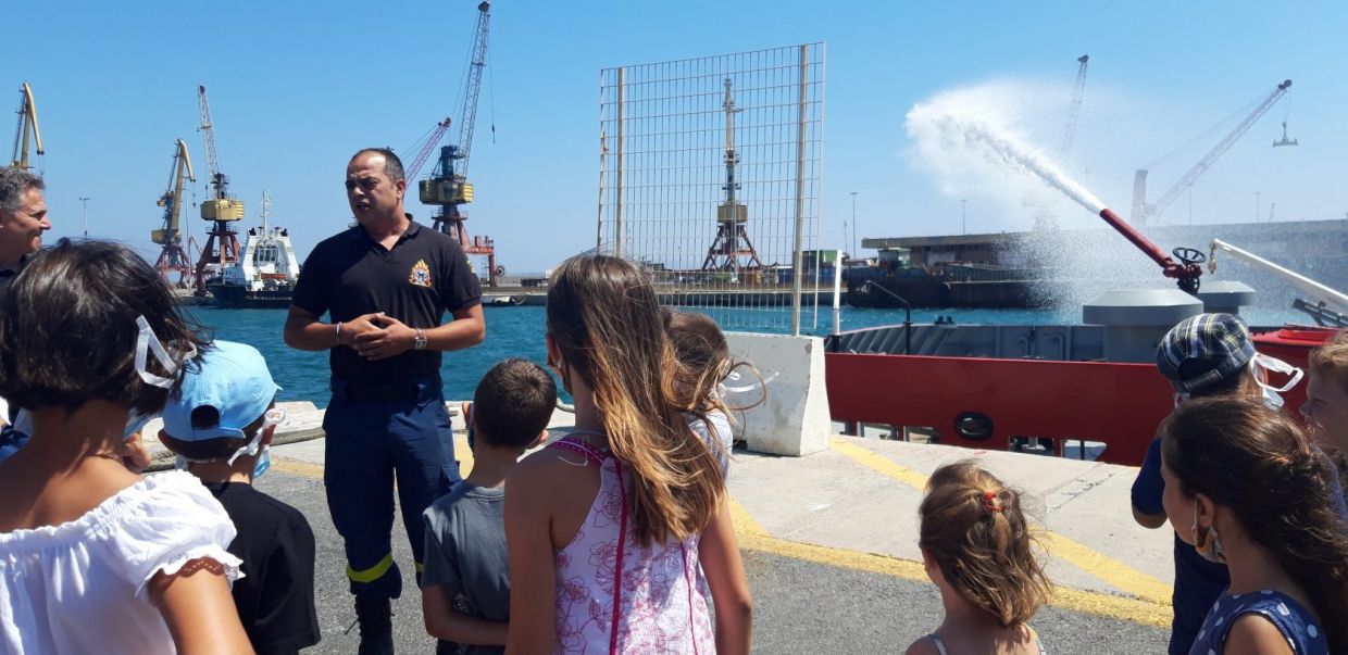 Επόμενος Σταθμός η προβλήτα υποδοχής των Κρουαζιεροπλοίων και στη συνέχεια ο Πυροσβεστικός Σταθμός με καλωσόρισμα από τον Διοικητή του 3ου Πυροσβεστικού Σώματος κ. Καραμπινάκη, με ενημέρωση καθώς και επίδειξη σβησίματος πυρκαγιάς πλοίου ή οποιουδήποτε πλεούμενου με διοχέτευση και εκτόξευση νερού από το Πυροσβεστικό Σκάφος.