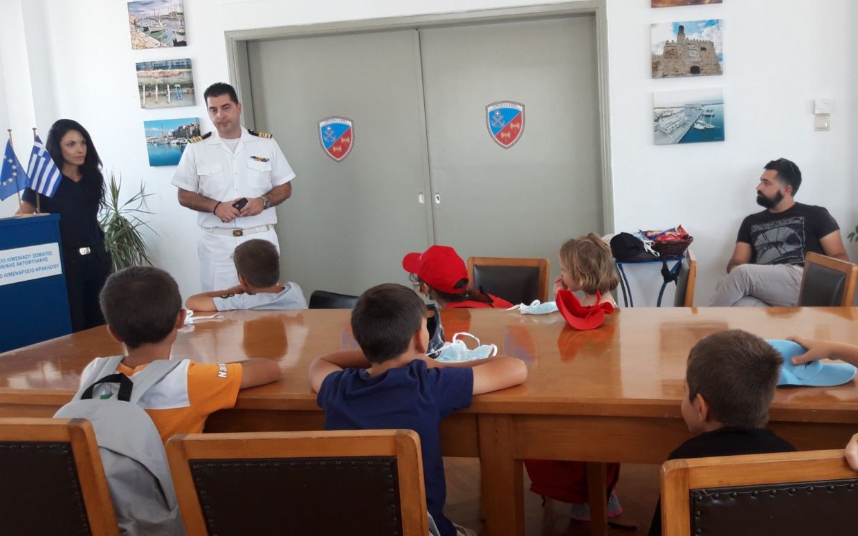 Τελευταίος προορισμός η επίσκεψη στο Κεντρικό Λιμεναρχείο Ηρακλείου και η θερμότατη υποδοχή από τον Λιμενάρχη Ηρακλείου κ. Δουβή στην αίθουσα συνεδριάσεων, όπου και εδώ η μία έκπληξη διαδεχόταν την άλλη. Στην αίθουσα συνεδριάσεων του ΚΛΗ προβλήθηκε βίντεο σχετικά με την συμπεριφορά των παιδιών στην θάλασσα, είτε αφορά την κολύμβηση είτε τα θαλάσσια σπορ, με τίτλο «Μαθαίνω-Προσέχω-Νοιάζομαι». Ο Λιμενάρχης Ηρακλείου κ. Δουβής προβάλλοντας δεύτερο βίντεο, τους εξήγησε τι είναι το Λιμενικό Σώμα και ποιος ο σκοπός και η αποστολή των λιμενικών σκαφών και των πληρωμάτων τους και στη συνέχεια αποχώρησαν με τις καλύτερες εντυπώσεις παίρνοντας αναμνηστικά δώρα, με προορισμό το Λιμενικό Σκάφος όπου διά ζώσης είδαν τα όργανα και τη λειτουργία του σκάφους.