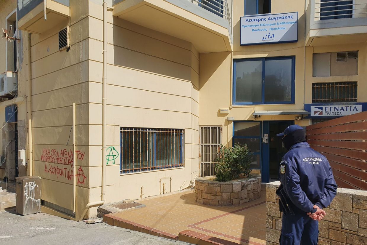 Ομάδα αγνώστων εισέβαλε στο γραφείο του Υφυπουργού Αθλητισμού Λευτέρη Αυγενάκη στο κέντρο του Ηρακλείου προκαλώντας μεγάλες υλικές ζημιές.