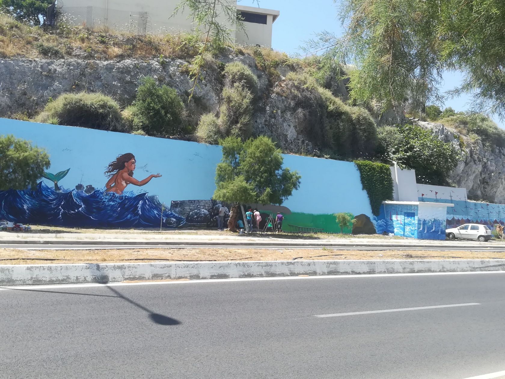 Μέλη της ομάδας ΖΩ ΔΡΩ ανέλαβαν δράση αρχές Μαΐου και μέσα στις επόμενες μέρες θα ολοκληρωθεί η εικαστική παρέμβαση που θα μεταμορφώσει τον τσιμεντένιο τοίχο, συνολικής επιφάνειας περίπου 450 τμ.