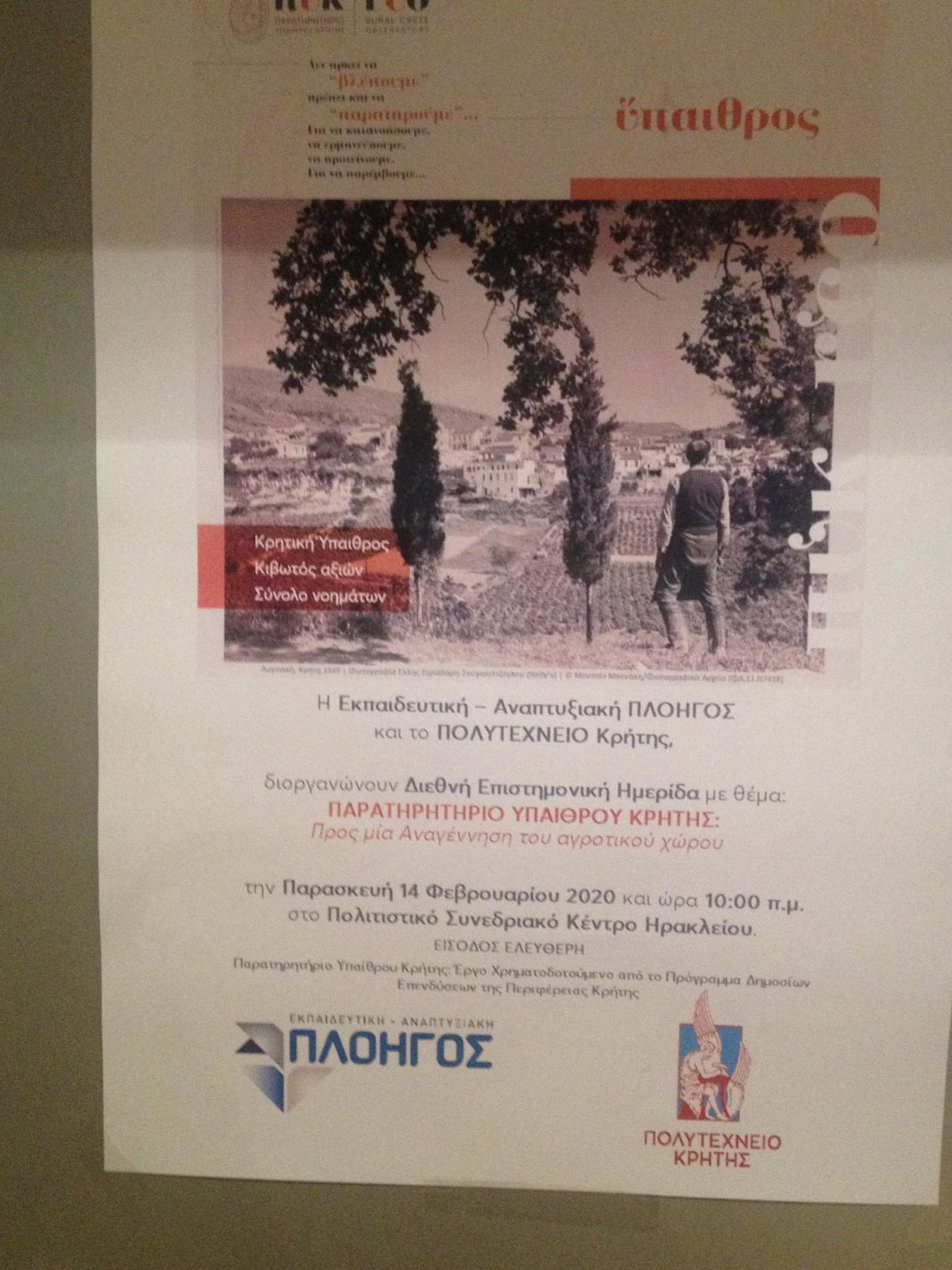 «Παρατηρητήριο Υπαίθρου Κρήτης: Προς μία Αναγέννηση του αγροτικού χώρου», είναι το θέμα της εκδήλωσης που πραγματοποιείται στο Πολιτιστικό Κέντρο Ηρακλείου, με καλεσμένους ομιλητές από, την Ελβετία, την Ισπανία, την Ιταλία και την Ελλάδα.