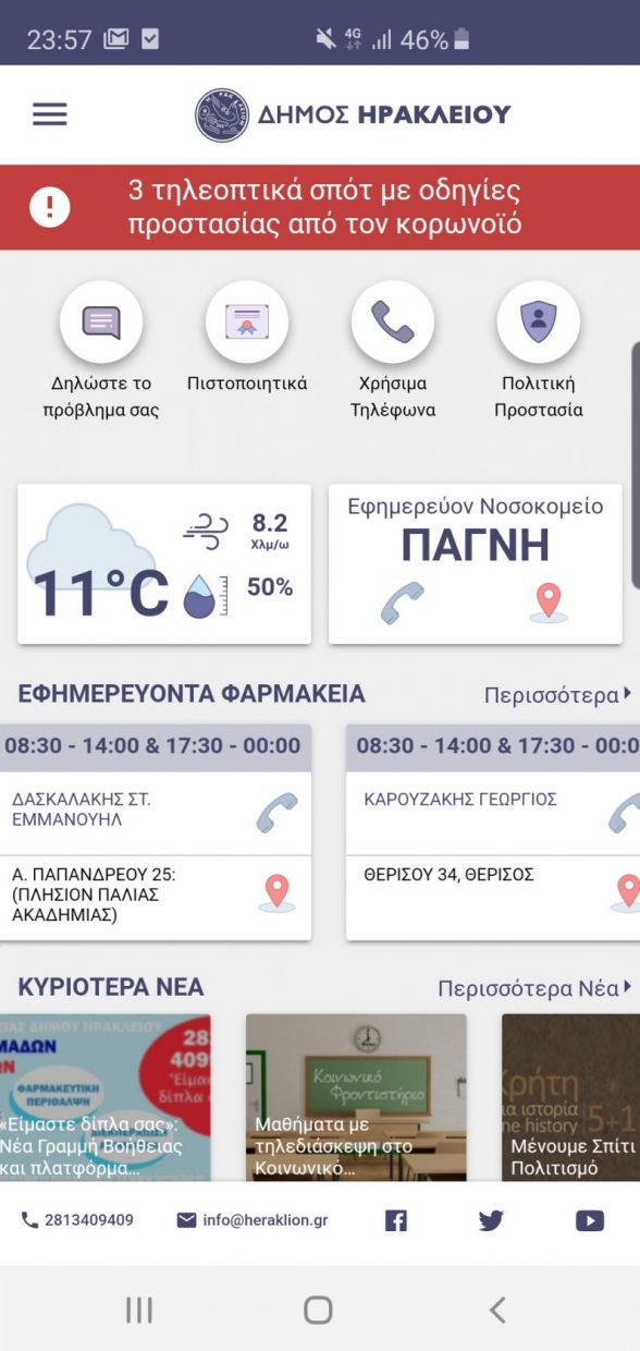 Υπενθυμίζουμε επίσης ότι μέσα από τον «ΔΗΜΟΤΗ ΗΡΑΚΛΕΙΟΥ», οι Δημότες μεταξύ άλλων μπορούν να υποβάλλουν αιτήματα για χορήγηση πιστοποιητικών, να βλέπουν τις εφημερίες των φαρμακείων και των νοσοκομείων, καθώς και χρήσιμα τηλέφωνα του Δήμου.