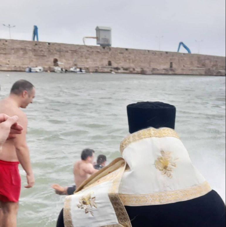 Μερικοί τολμηροί νέοι βούτηξαν στα παγωμένα και τρικυμιώδη νερά για να ανασύρουν τον Τίμιο Σταυρό και να λάβουν την ευλογία Του.