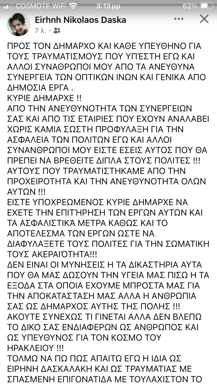Σε ανάρτησή της η κ.Δασκαλάκη ζητά παρέμβαση του Δημάρχου Ηρακλείου Αλέξη Καλοκαιρινού τονίζοντας “κ.Δήμαρχε έχετε χρέος να μας προστατέψετε, κάντε το επιτέλους”.
