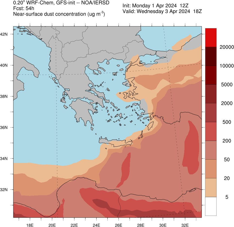 Ο πρώτος χάρτης παρουσιάζει τον χάρτη συγκέντρωσης σκόνης από το μοντέλο πρόγνωσης DUST/METEO του Εθνικού Αστεροσκοπείου Αθηνών για την Τρίτη 02/04 το μεσημέρι και ο δεύτερος χάρτης τη συγκέντρωση σκόνης που προβλέπεται για το απόγευμα της Τετάρτης 03/04.