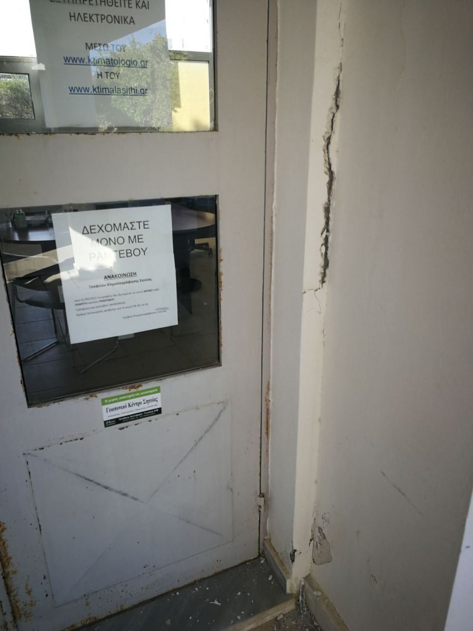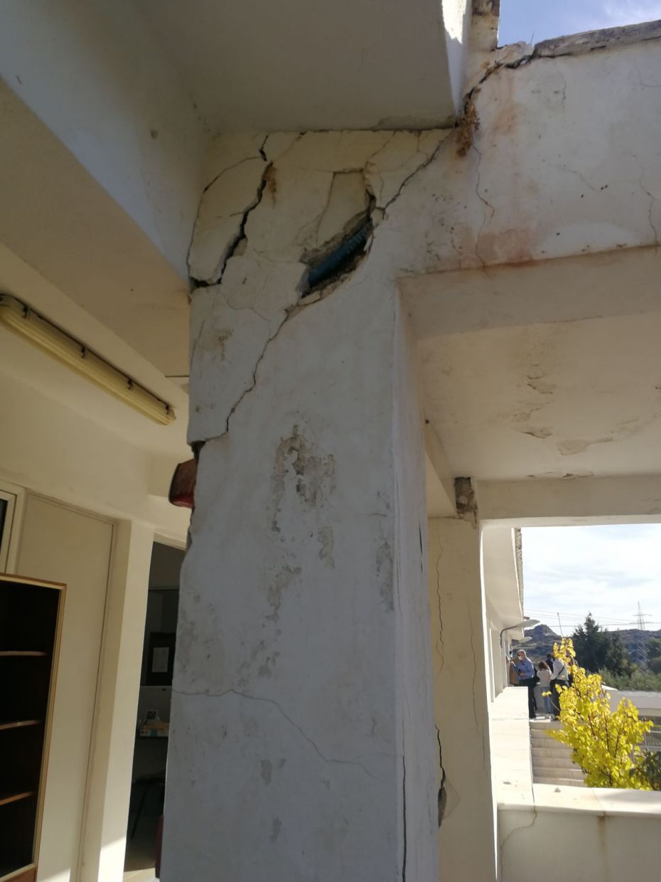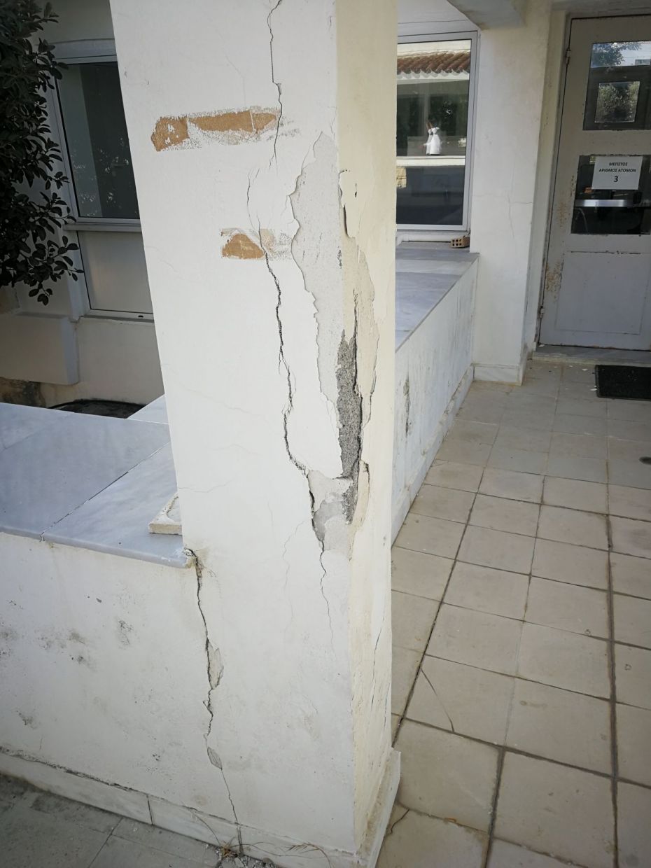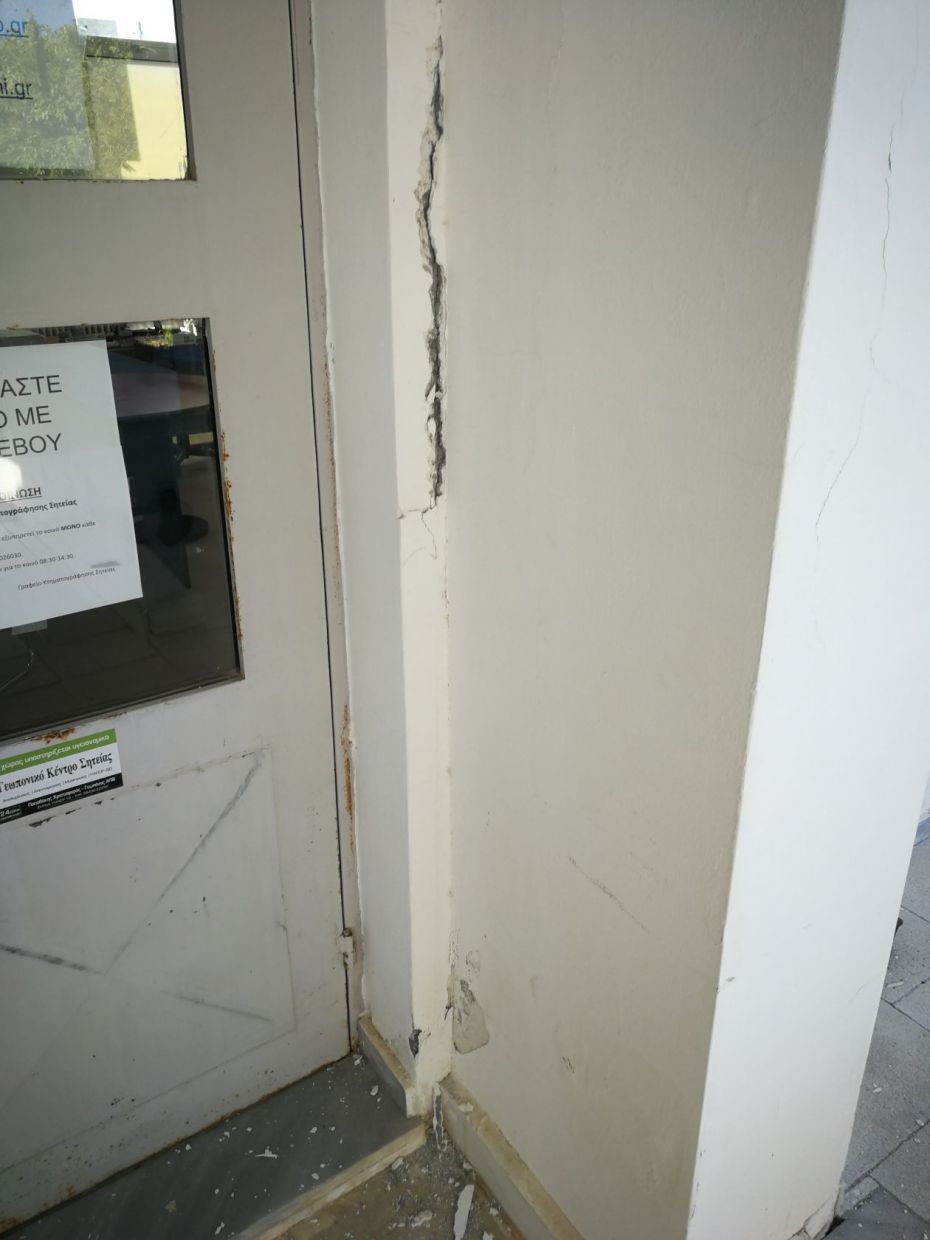 Στο κτίριο του π.ΚΕΓΕ είναι φανερό ότι το πρόβλημα είναι τεράστιο αφού μιλάμε για κτίρια που είχαν σοβαρες φθορές πριν ακόμα από τον πρόσφατο σεισμό. Πέρα από την καθίζηση που υπάρχει παντού, σε όλα τα γραφεία, επιδεινώθηκε η κατάσταση σε κολώνες που έχουν τρύπες και άλλες φθορές παλαιότερες και καινούριες. Μεγάλα προβλήματα είναι ορατα με γυμνό μάτι σε δομές, γραφεία, που εργάζονται δεκάδες εργαζόμενοι, εξυπηρετούνται πάρα πολλοί πολίτες, παιδιά και ΑμΕΑ καθημερινά. Το κλιμάκιο του Κόμματος διαπίστωσε ότι σύσσωμοι οι εργαζόμενοι αισθάνονται τεράστια ανασφάλεια ιδιαίτερα μετά την τεράστια επιβάρυνση που δέχθηκε ένα ήδη επισφαλές κτίριο.