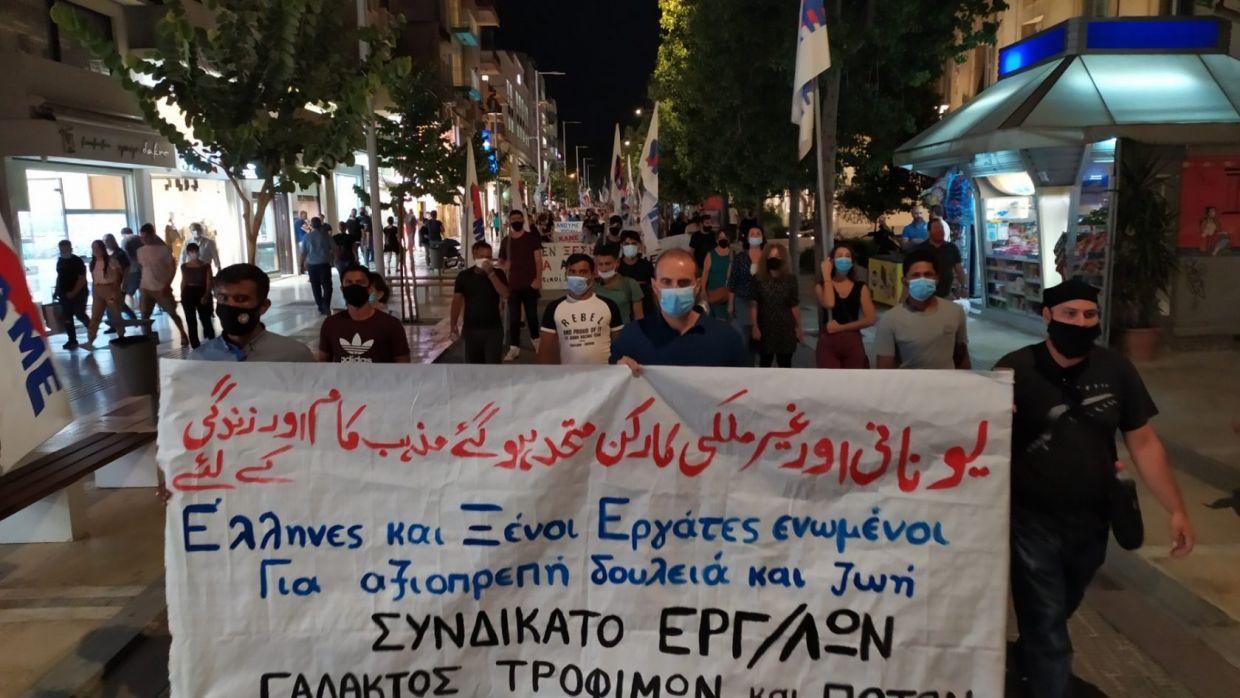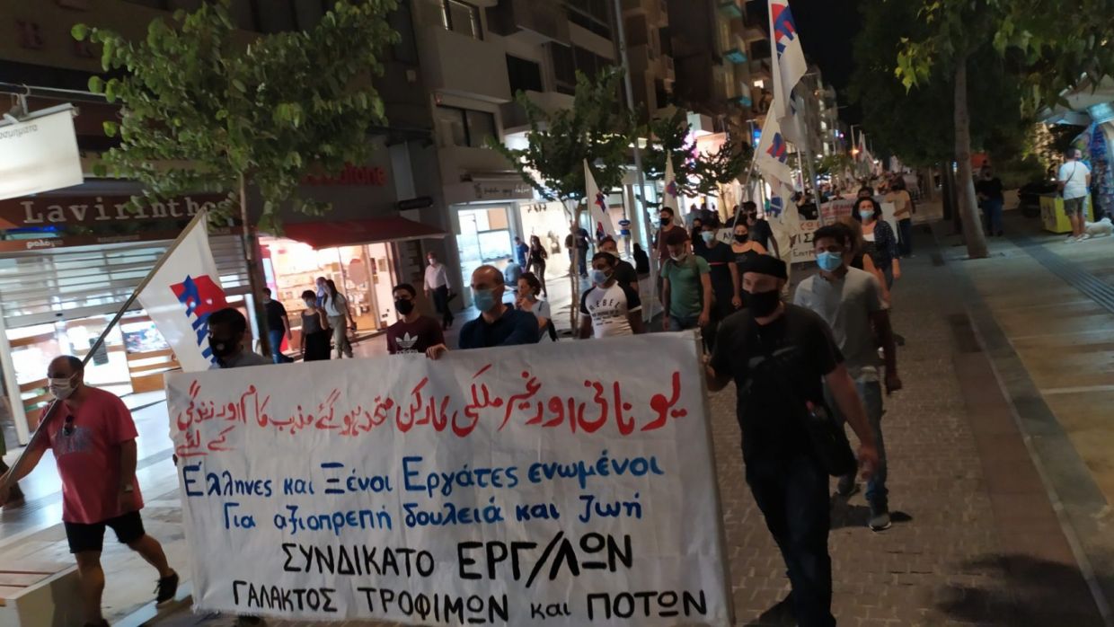 Με την ολοκλήρωση της κεντρικής ομιλίας το συλλαλητήριο συγκροτήθηκε οργανωμένα σε διαδήλωση πίσω από τα πανό των σωματείων. Ακολούθησε πορεία στους κεντρικούς δρόμους του Ηρακλείου, με επικεφαλής τα πανό της Γραμματείας Ηρακλείου του ΠΑΜΕ και του Συνδικάτου Εργατοϋπαλλήλων Γάλακτος,Τροφίμων και Ποτών που συμβολικά ανέφερε στα ελληνικά και τα ούρντου, τη γλώσσα σημαντικού μέρους μεταναστών εργατών γης και μελών του: «ΕΛΛΗΝΕΣ ΚΑΙ ΞΕΝΟΙ, ΕΡΓΑΤΕΣ ΕΝΩΜΕΝΟΙ». Πίσω από το πανό ξεχώρισε η συμμετοχή των μεταναστών εργατών, ενώ συμβολικά επόμενο ήταν το πανό του Αγροτικού Συλλόγου Ηρακλείου για να διατρανωθεί και έτσι η συμμαχία εργατών και αυτοαπασχολούμενων, φτωχών αγροτών. Πως οι αγρότες έχουν κοινά συμφέροντα με τους εργάτες, έλληνες και ξένους, και όχι με τους καπιταλιστές της υπαίθρου. Πίσω βάδισαν συντεταγμένα οι διαδηλωτές με τα πανό των υπολοίπων σωματείων.