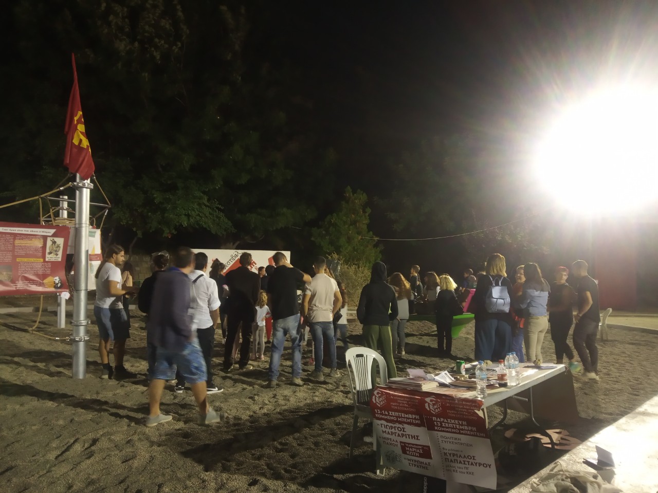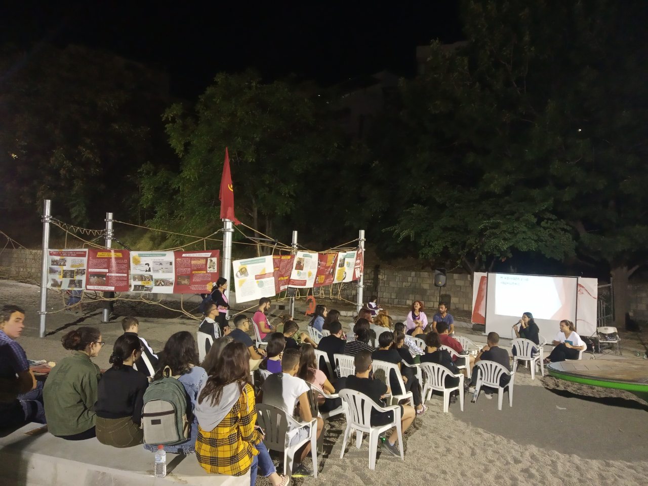 Στο πάρκο είχε στηθεί με την εθελοντική δουλειά των μελών και φίλων του ΚΚΕ και της ΚΝΕ μια κόκκινη πολιτεία. Από νωρίς το απόγευμα κάθε μέρας πλήθος κόσμου, νεολαίας από όλους τους χώρους, συγκεντρώνονταν ανταποκρινόμενοι στο κάλεσμα της ΚΝΕ.