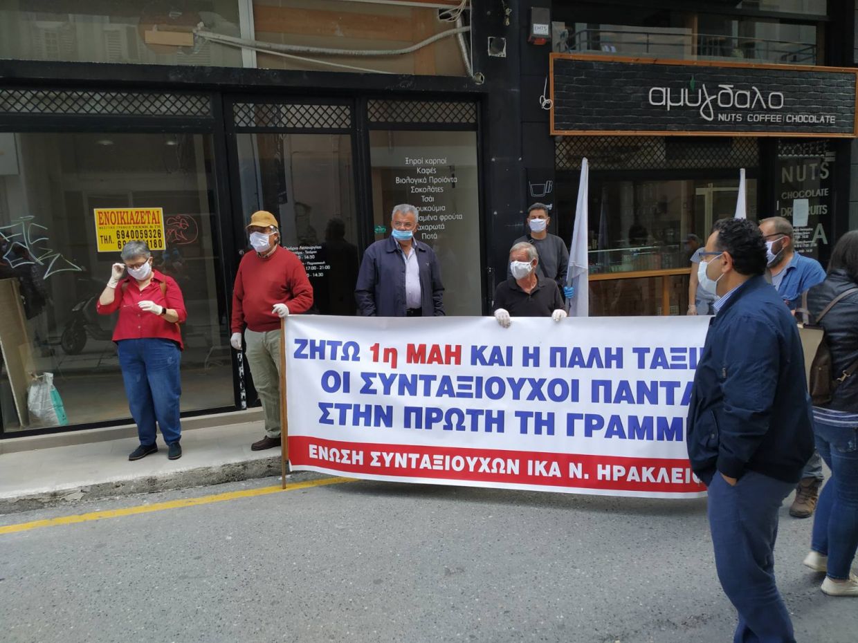 Τα ανάλογα συνέβησαν και στο Ηράκλειο με τους εκπροσώπους σωματείων και φορέων να συγκεντρώνονται σε κεντρικά σημεία της πόλης με τα πανό για την Πρωτομαγιά, με απόλυτη επιτυχία.