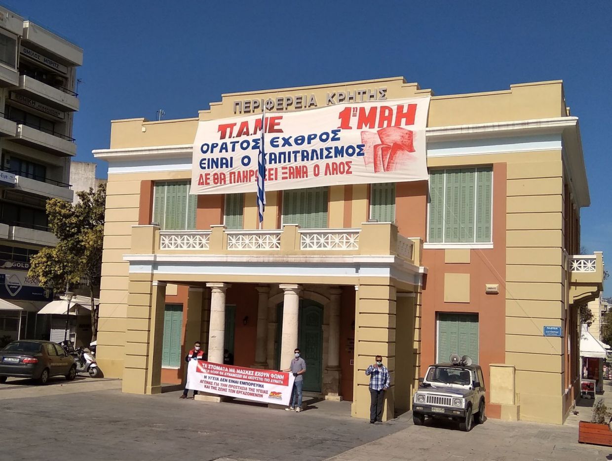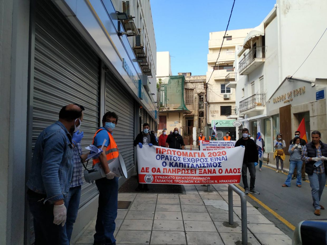 Τα ανάλογα συνέβησαν και στο Ηράκλειο με τους εκπροσώπους σωματείων και φορέων να συγκεντρώνονται σε κεντρικά σημεία της πόλης με τα πανό για την Πρωτομαγιά, με απόλυτη επιτυχία.