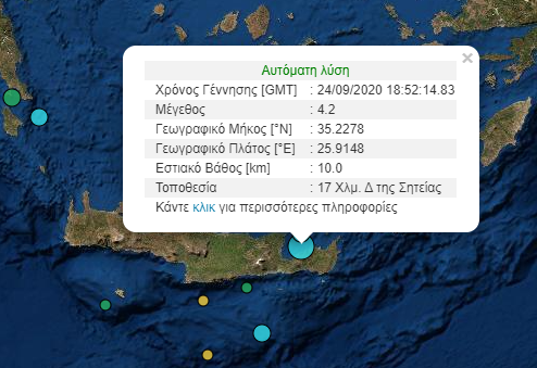 Η σεισμική δόνηση σημειώθηκε 17 χλμ δυτικά της Σητείας με ένταση 4,2 βαθμών της κλιμακας Ρίχτερ, σύμφωνα με το Γεωδυναμικό Ινστιτούτο του Εθνικού Αστεροσκοπείου Αθηνών, ενώ το εστιακό του βάθος υπολογίζεται στα 10 χλμ.