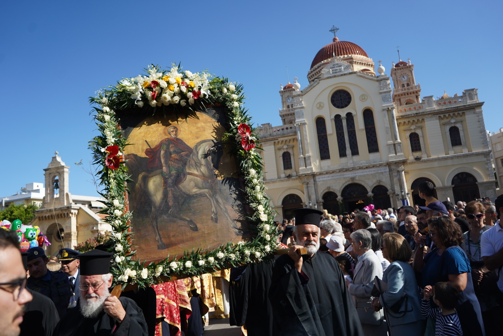Νωρίτερα, είχε τελεστεί ο Όρθρος και η Συνοδική Θεία Λειτουργία, παρουσία πλήθος κόσμου, ανάμεσα τους ο Περιφερειάρχης Κρήτης, Σταύρος Αρναουτάκης αλλά και ο Δήμαρχος Ηρακλείου Βασίλης Λαμπρινός. Από νωρίς το πρωί εκατοντάδες άνθρωποι συνέρρεαν στον Άγιο Μηνά προκειμένου να ανάψουν ένα κερί στη χάρη Του.
