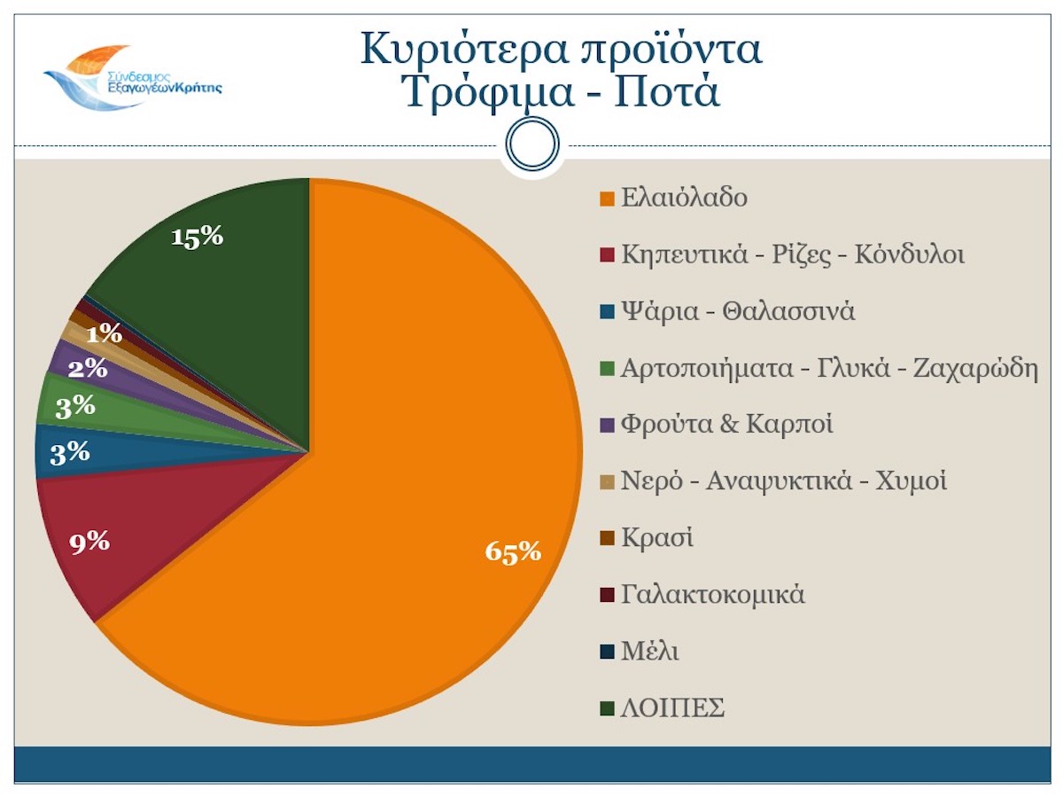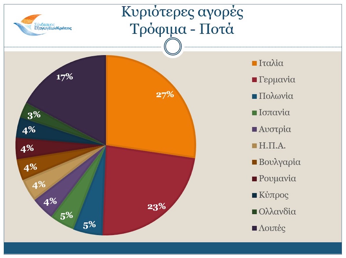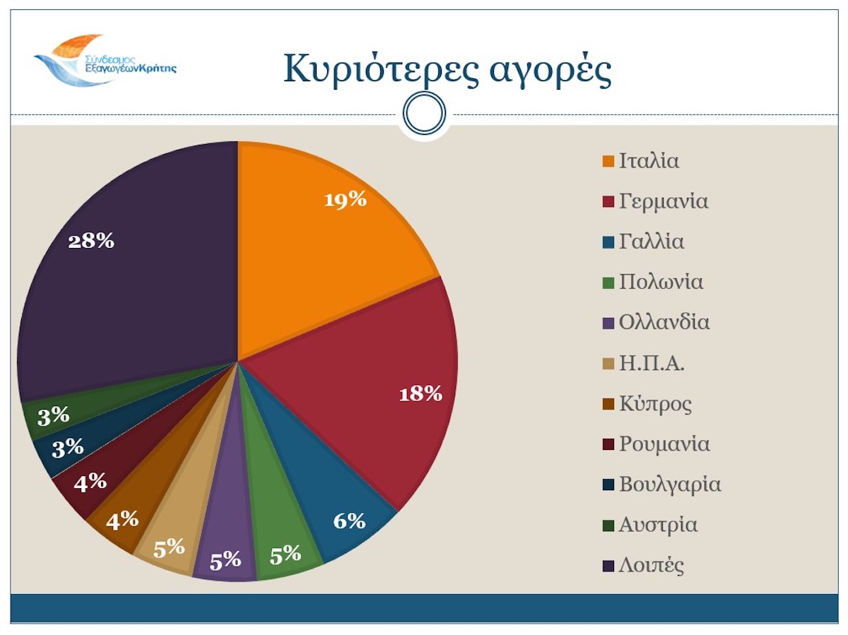 Σχετικά με τις αγορές, οι κυριότεροι προορισμοί των κρητικών προϊόντων είναι η Ιταλία (68 εκ. ευρώ και μερίδιο 18,6%), η Γερμανία (67 εκ. ευρώ και μερίδιο 18,3%), η Γαλλία (24,1 εκ. ευρώ, μερίδιο 6,6%), η Πολωνία (18,4 εκ. ευρώ, μερίδιο 5%) και η Ολλανδία (17,3 εκ. ευρώ και μερίδιο 4,7%). Τη δεκάδα των κυριότερων αγοραστών κλείνουν οι Η.Π.Α., η Κύπρος, η Ρουμανία, η Βουλγαρία και η Αυστρία.