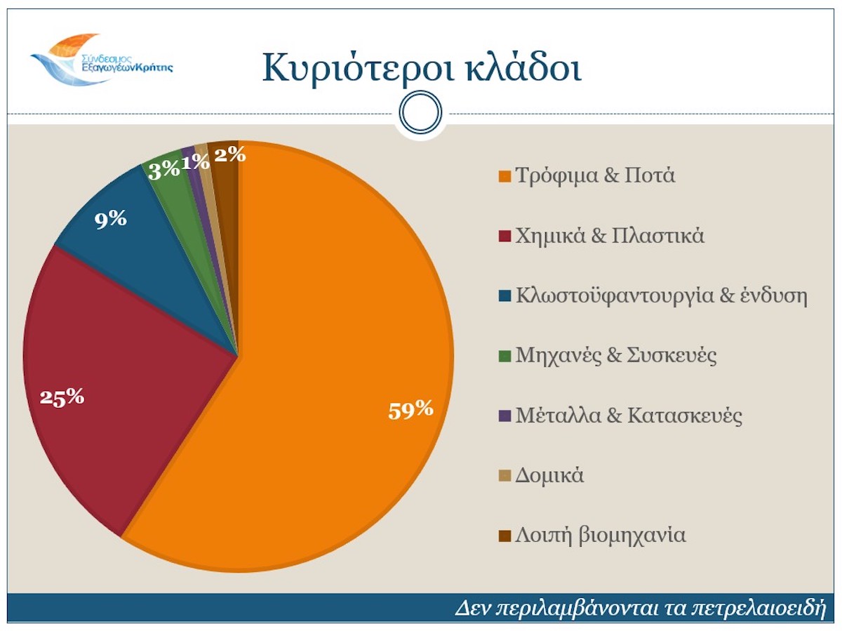 Ο κλάδος των Τροφίμων και Ποτών, ο οποίος αποτελεί το 59,2% του συνόλου των Κρητικών εξαγωγών με 216,2 εκ. ευρώ, παρουσιάζει μείωση ίση με 50,3%. Ο κλάδος των Χημικών & Πλαστικών έρχεται δεύτερος, με μερίδιο 24,5% επί του συνόλου των εξαγωγών της Κρήτης και μείωση της τάξεως του 3,6%. Ακολουθούν οι κλάδοι της Κλωστοϋφαντουργίας & Ένδυσης (μερίδιο 8,8% και μείωση 9,3%), των Μηχανών & Συσκευών (μερίδιο 3,2% και αύξηση 77%) και με μικρότερα μερίδια τα Μέταλλα & κατασκευές, τα Δομικά Υλικά και τα λοιπά βιομηχανικά προϊόντα.