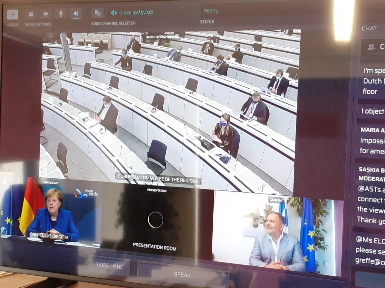 Στη σύνοδο η Καγκελάριος της Ομοσπονδιακής Δημοκρατίας της Γερμανίας κα Άνγκελα Μέρκελ παρουσίασε στα μέλη της ΕτΠ τις προτεραιότητες της γερμανικής Προεδρίας της Ε.Ε. για την αντιμετώπιση των επιπτώσεων του Covid-19 και συζήτησε με τα μέλη της Επιτροπής για τον ρόλο της Τοπικής και Περιφερειακής Αυτοδιοίκησης στην ανάκαμψη της Ευρώπης.