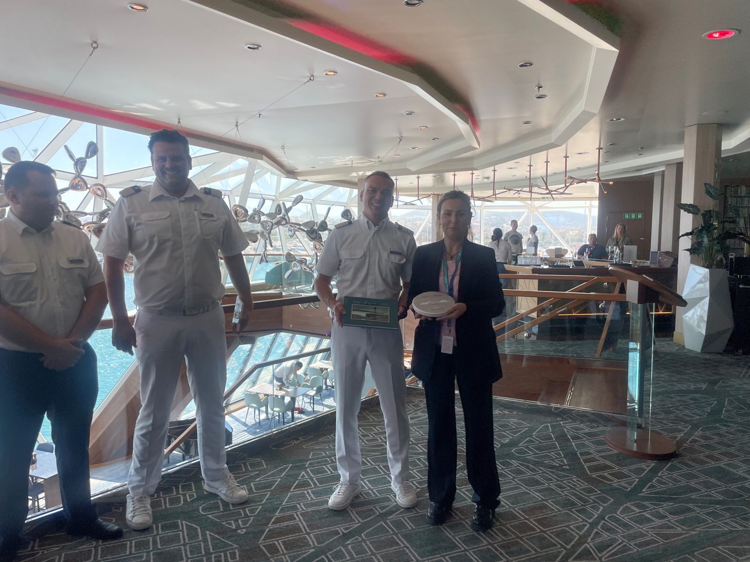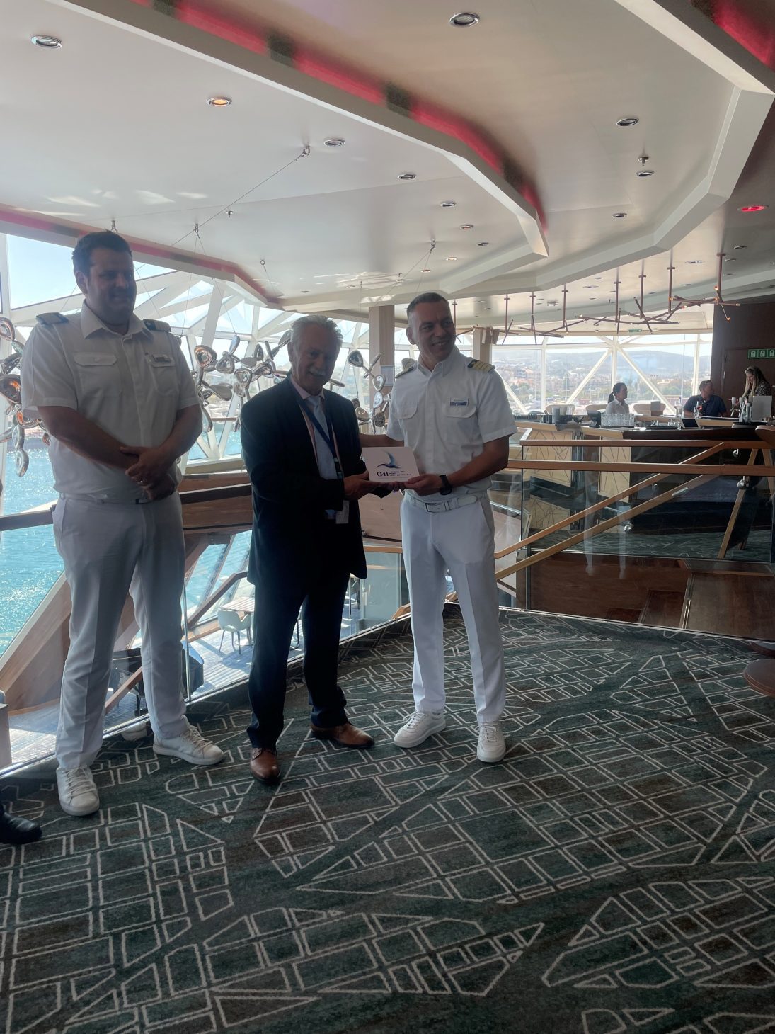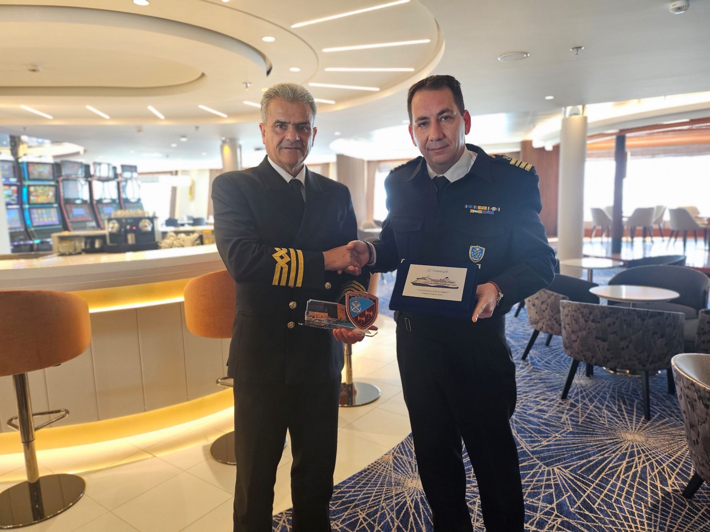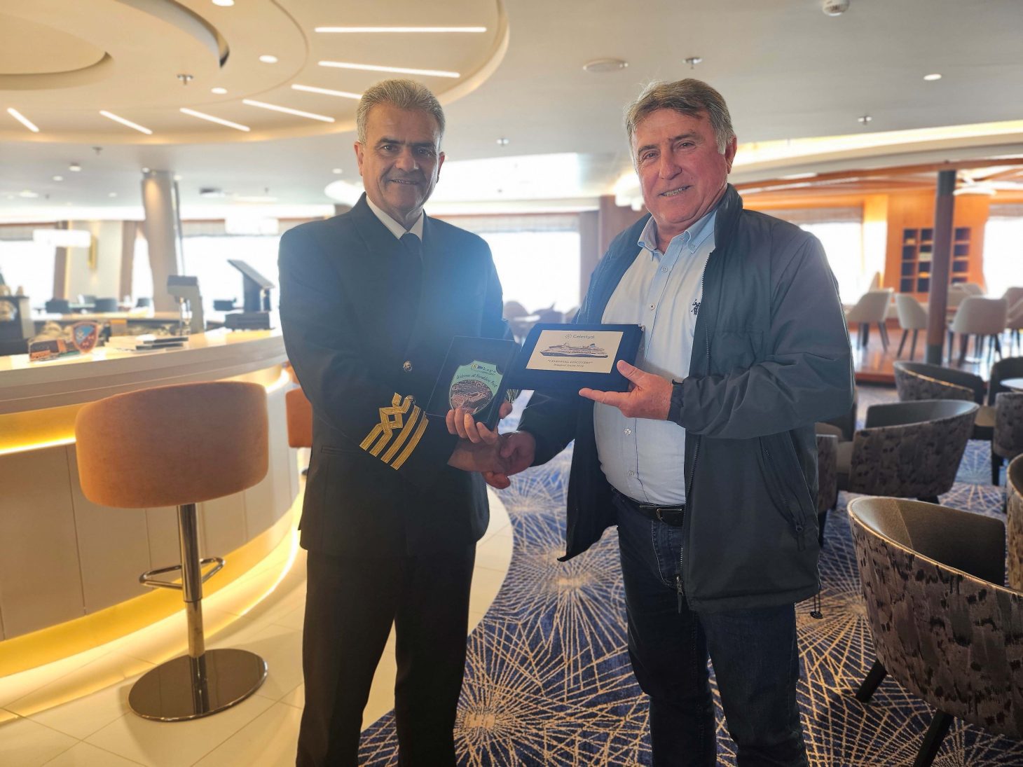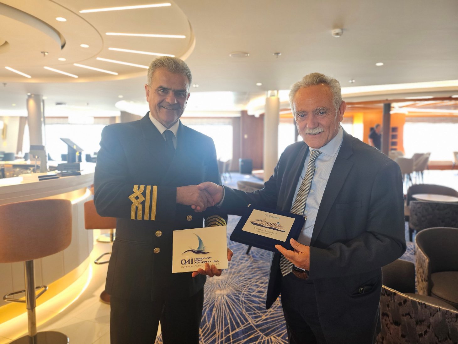 Στη συνέχεια ο Πρόεδρος του ΟΛΗ κ. Ιωάννης Βαρδαβάς αντάλλαξε αναμνηστική πλακέτα με τον Καπετάνιο του κρουαζιερόπλοιου, δηλώνοντας ότι η αναβάθμιση του επιπέδου υπηρεσιών και η ανάδειξη του Λιμένος Ηρακλείου σε Home Port αποτελεί την απόδειξη ότι το Λιμάνι του Ηρακλείου βρίσκεται δυναμικά στο χάρτη της κρουαζιέρας.