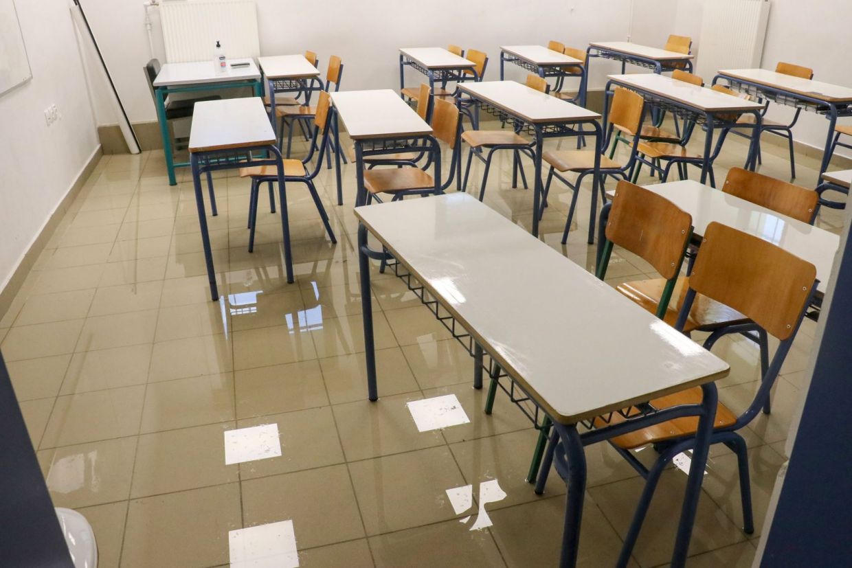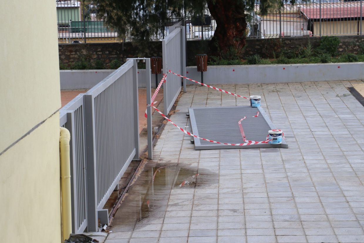 Το σχολείο που παραδόθηκε μόλις πέρσι, πλημμύρισε με αποτέλεσμα οι μαθητές να αναγκαστούν να βγουν εκτός του κτιρίου, αδυνατώντας να πραγματοποιηθεί μάθημα υπό τέτοιες συνθήκες.
