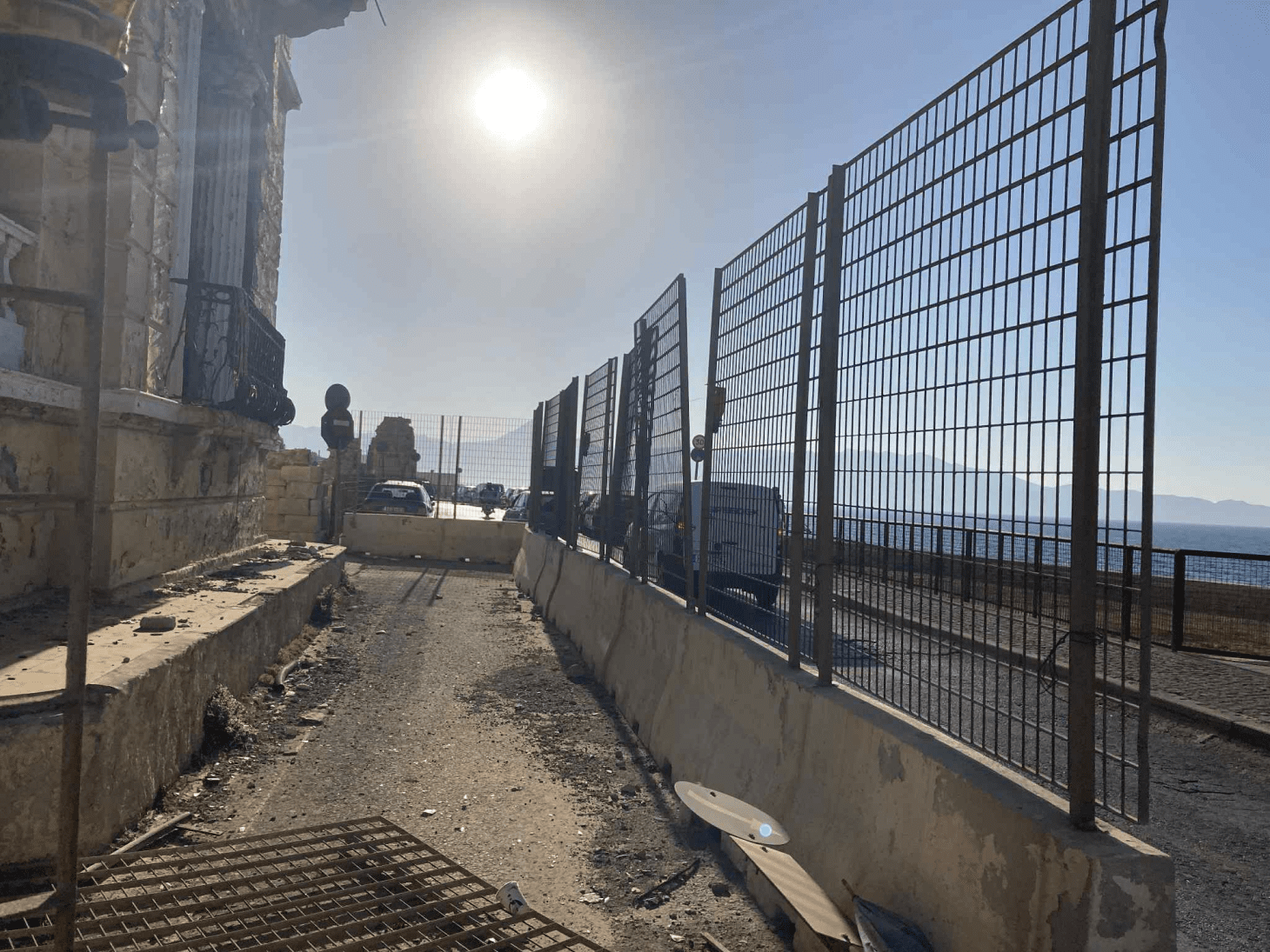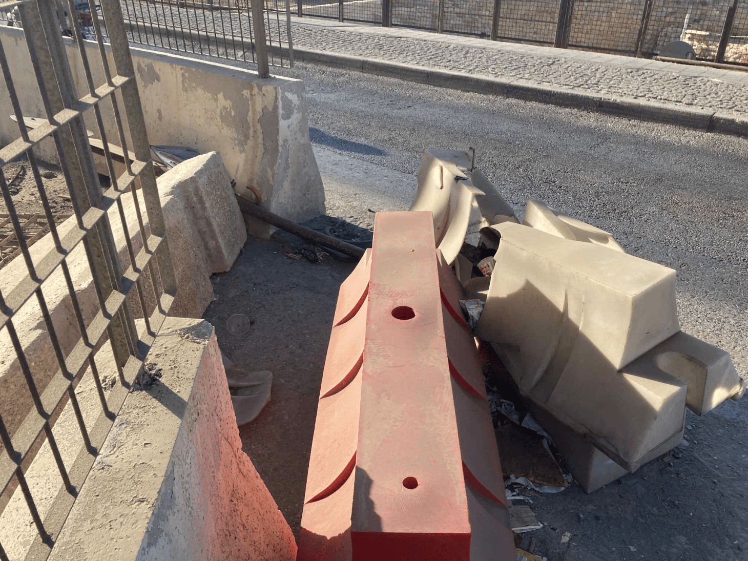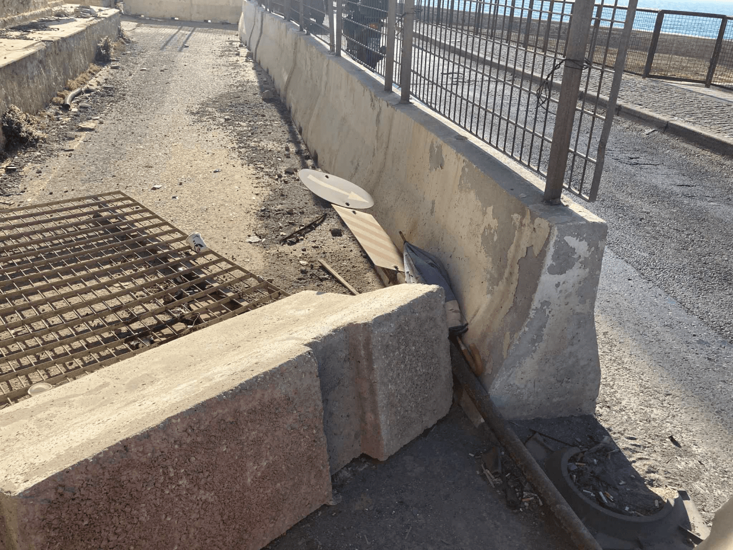 Στις εικόνες ντροπής από τα μέσα του 2023 αναφερόμαστε, όταν είτε από κακοκαιρία και έντονους ανέμους ,είτε γιατί κάποιο όχημα προσέκρουσε στις τσιμεντένιες βάσεις της περίφραξης, τα κάγκελα …κείτονται για 2,5 χρόνια στο έδαφος. Πινακίδα του ΚΟΚ παρασυρμένη και αυτή. Το εσωτερικό της περίφραξης σκουπιδότοπος και μια εικόνα που αν μη τι άλλο σε κάνει να αναρωτιέσαι:” Mα τελικά τόσο αδιάφοροι είναι όλοι τους ή δεν κυκλοφορούν καν στην πόλη;”