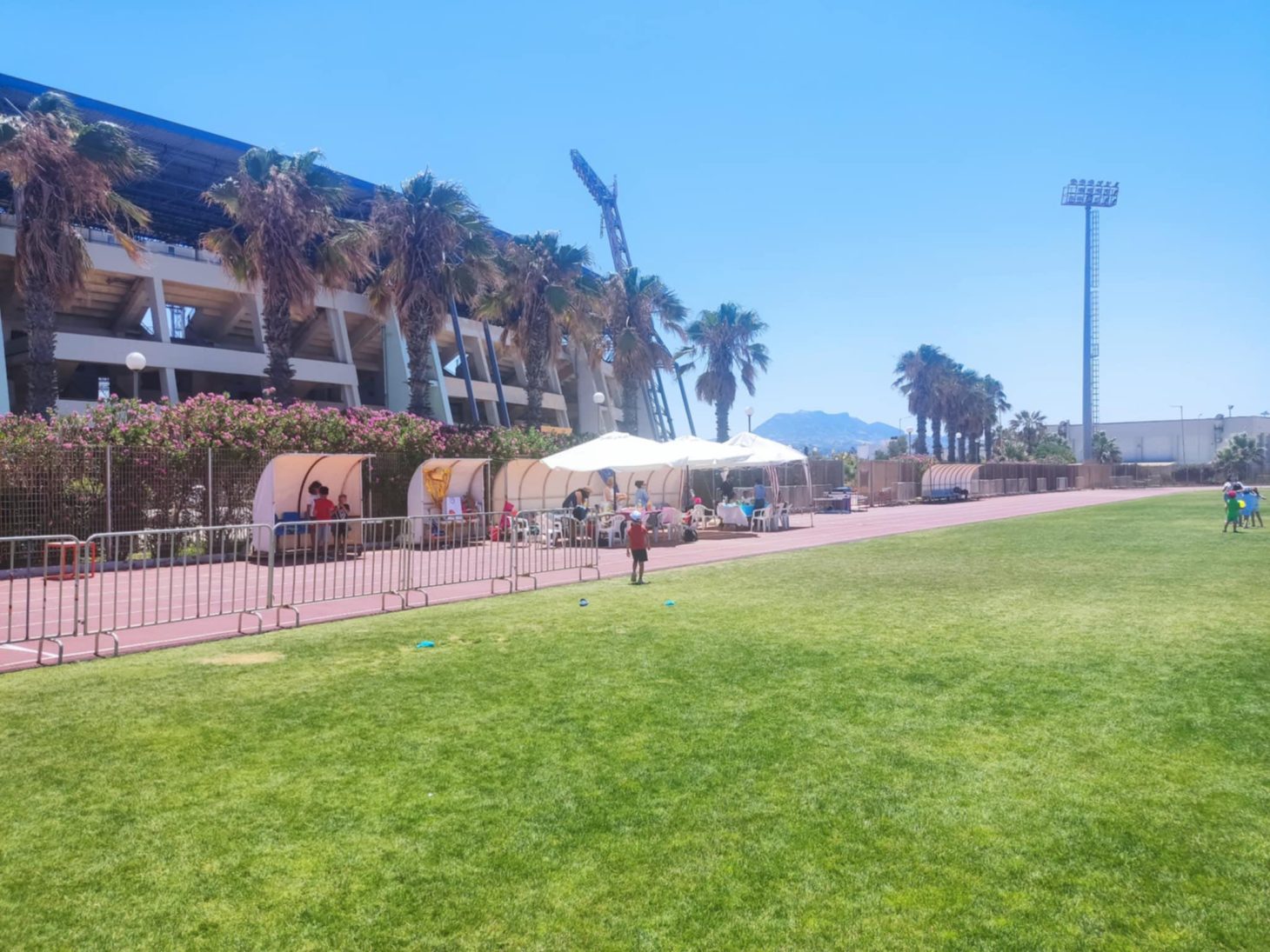 Στο βοηθητικό στάδιο που μπορούσαν να κάνουν προπόνηση, προπονητές με τους αθλητές τους πήγαν το πρωί αλλά έπεσαν πάνω σε κάτι ομπρέλες, καθίσματα, ροτόντες, μπαλόνια που έχουν στηθεί στο ταρτάν καθώς και κάτι φουσκωτά «πισινάκια» στο χλοοτάπητα.