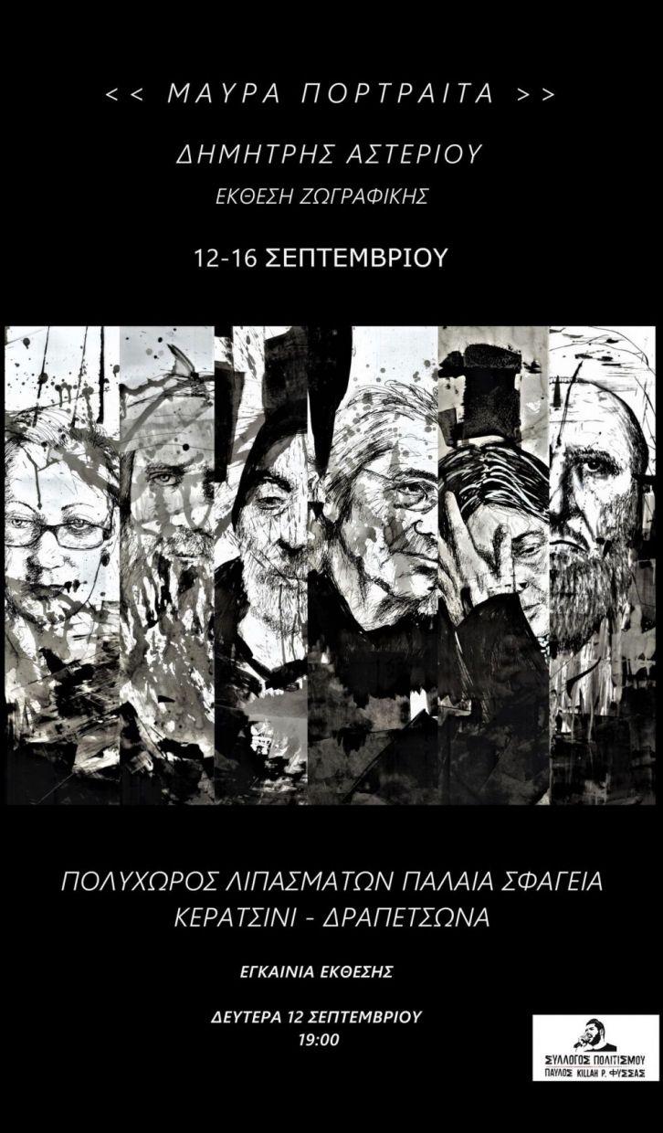 Ο ζωγράφος – εικαστικός Δημήτρης Αστερίου σας προσκαλεί στα εγκαίνια της Έκθεσης Ζωγραφικής με τίτλο «ΜΑΥΡΑ ΠΟΡΤΡΑΙΤΑ», που θα διοργανωθεί στον Πολυχώρο Λιπασμάτων Δραπετσώνας – Κερατσινίου (περιοχή παλαιά Σφαγεία), στις 12 Σεπτεμβρίου 2022, ώρα: 19.00.